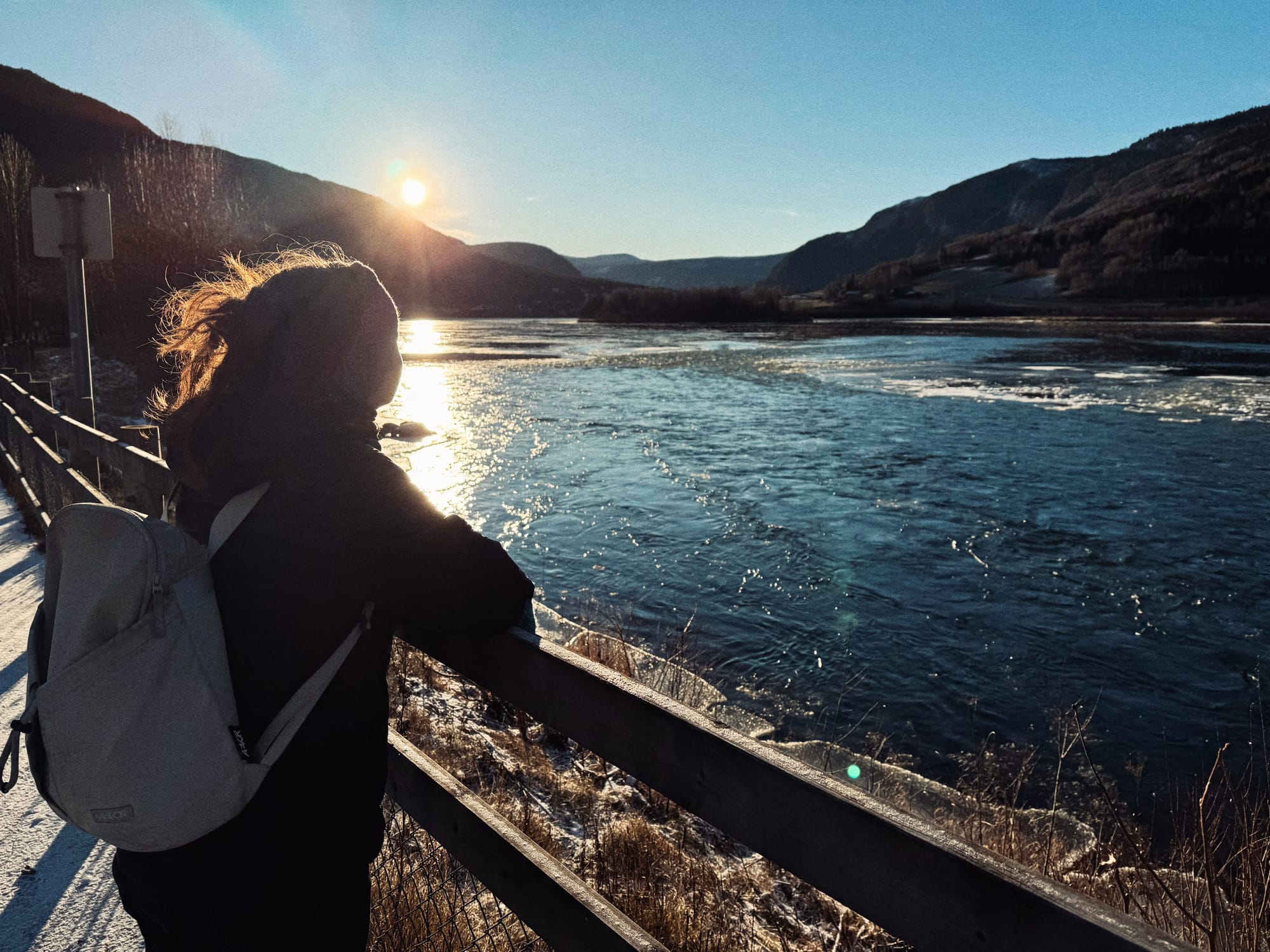 Ich lasse das Fahrrad ausrollen, stütze mich auf den Zaun, dessen Pfähle mit Moos und Flechten bewachsen sind, und richte mein Gesicht in die feinen Sonnenstrahlen, die gerade erst den Bergkamm überwunden haben. Unter mir am Flussufer treiben kleine Eisschollen, und für die nächsten Tage hat sich wieder Schnee angekündigt. Ich schließe die Augen und lasse das goldene Licht durch meine Lider und gefühlt bis in die hintersten Winkel meiner Seele scheinen. Es ist selten geworden, dass ich noch direktes Sonnenlicht abbekomme, und es fühlt sich jedes Mal wie ein Luxus an.