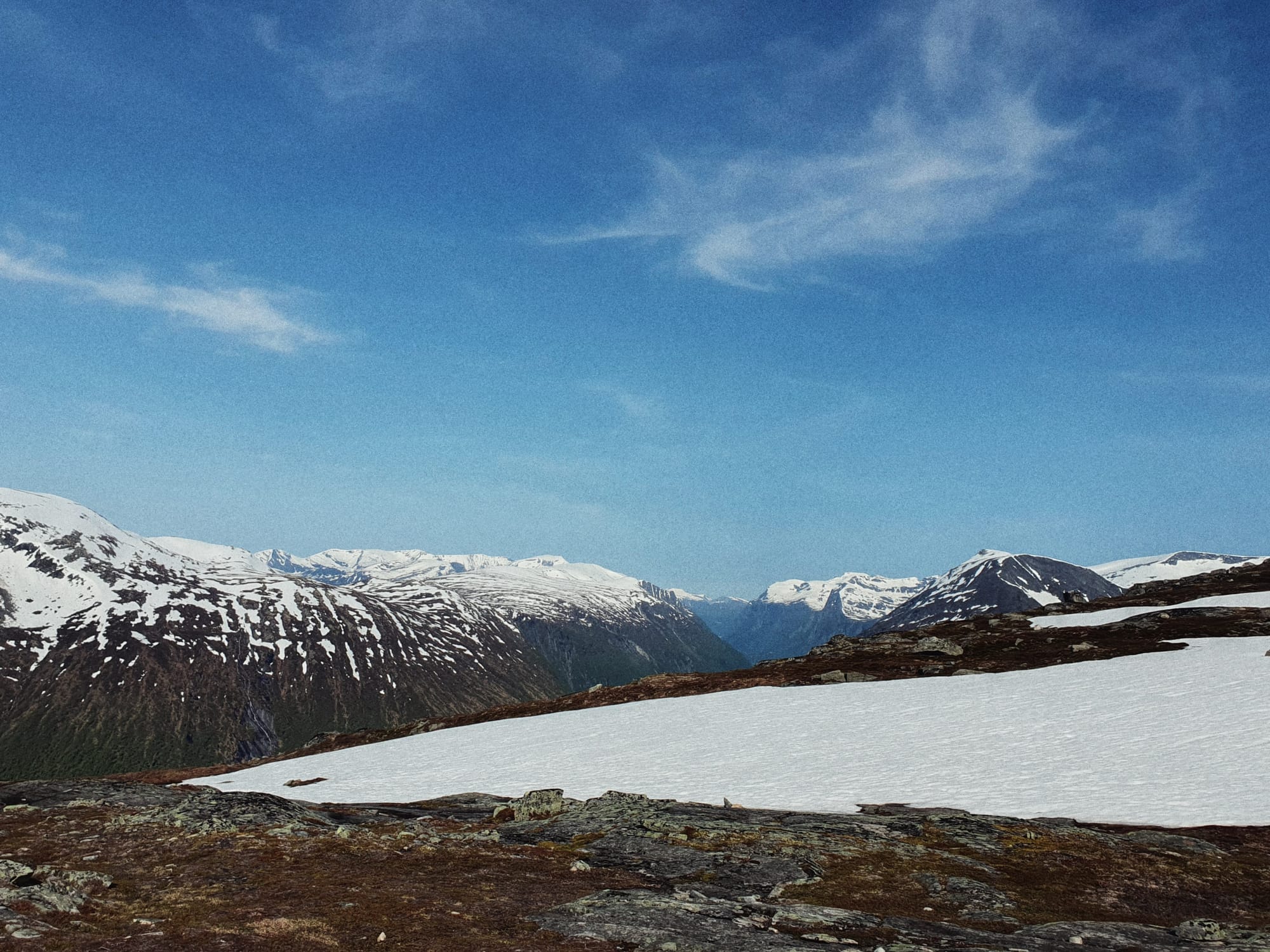 Kurz, nachdem ich wieder angekommen war, bot mir mein Schichtplan dann die perfekte Gelegenheit, um die angekündigten drei Tage Sommerwetter für einen Vantrip zu nutzen. Es ging ein Stück nordwärts an die Küste, wo ich mir eine Wanderung mit ein paar Höhenmetern rausgesucht hatte 😉. Oben auf dem Berg musste ich auch noch über ein paar Schneefelder stapfen, bzw. hab ich mir einen Weg drumherum gesucht, wo es möglich war (bei dem Tauwetter weiß man ja nie). Da ich früh unterwegs war, habe ich erstens: niemanden getroffen (bis auf zwei Wanderer, als ich aber schon wieder am Absteigen war), und zweitens: den restlichen Tag noch nutzen können und bin in den Fjord gehüpft. Also eigentlich sollte es Fjord sein, aber entweder hatte ich eine Geschmacksverirrung, oder an der Stelle war das Wasser gar nicht salzig. Habe es mehrmals getestet, weil ich richtig verwirrt war 😄.