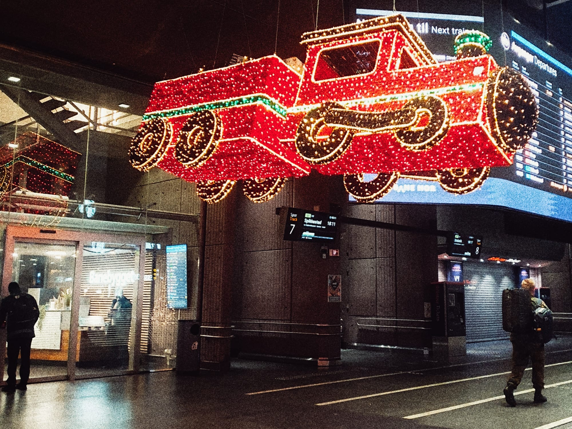Einmal umsteigen muss ich. Der Osloer Hauptbahnhof erstrahlt in schönster Weihnachtsdekoration: Lichterketten ranken sich um Geländer und über Geschäfte hinweg. Riesige goldene Kugeln hängen über den Wartebereichen. Vor der unfassbar großen Anzeigetafel steht ein fast deckenhoher Weihnachtsbaum, prall behangen in Rot und Gold und mit Lichterketten. Weiter hinten fliegt eine Dampflok unter der Decke mit einem Anhänger voller Geschenke. Sie erstrahlt in rot, grün, und gold und klaut dem Weihnachtsbaum ein bisschen die Show. Nicht nur ich bleibe stehen und mache ein Foto. All die Menschen: Daunenjacken, lange Mäntel und leichte Jacken laufen an mir vorbei. Ich gehöre zur Gruppe, die am wärmsten angezogen ist. Denn da wartet einer in Pulli und kurzer Hose. Natürlich. Die wenigsten tragen Winterschuhe. Hier treffen Wollmützen und Röcke, Skiausrüstung und Sneaker aufeinander. Rucksäcke, Aktentaschen, Rollkoffer und Dufflebags suchen sich ihren Weg durch den Bahnhof. Moment mal, braune Fellstiefel, roter Hoodie, schwarzer langer Mantel, weiße Haare – war das der Weihnachtsmann? Nur die fingerlosen Lederhandschuhe müsste er vielleicht erklären… Aber ich gebe vermutlich auch ein gutes Bild ab, wie ich mit Rucksack und einer Heizung unterm Arm hier stehe. Die hab ich nämlich noch von meinen Freunden geschenkt bekommen, da sie die ausgetauscht haben. Ob ich die wohl im Zug anschließen kann?