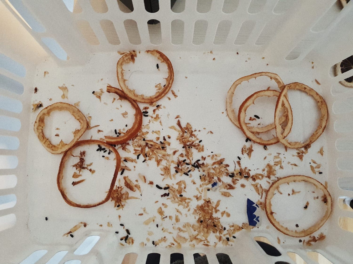 Und als ich am nächsten Morgen in den Keller gehe und meine Weihnachtsdekoration hochholen will, finde ich statt Girlanden nur noch ein paar fein abgenagte Orangenschalen vor. Außerdem Hinterlassenschaften der kleinen Maus und einige meiner Spinnen fehlen… Zwei Tage später kommt mein Vermieter und repariert das Loch in einem der Lüftungsventile in der Kellerwand. Weiterer Zugang für Mäuse verboten. Aber mehr Essbares ist in meinem Keller auch nicht zu finden. Schlaf gut, kleine Maus 🍊